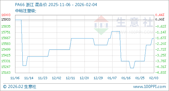 2月4日,生意社PA66基准价为15666.67元/吨,与本月初(15566.67元/吨)相比,上涨了0.64%。