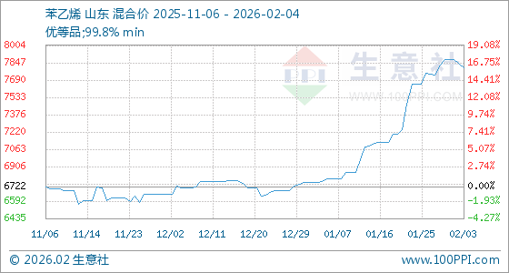 2月4日,生意社苯乙烯基准价为7800.00元/吨,与本月初(7874.00元/吨)相比,下降了0.94%。