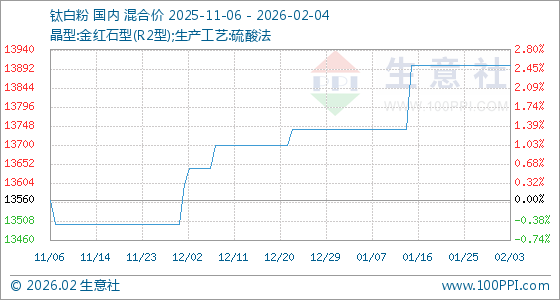 2月4日,生意社钛白粉基准价为13900.00元/吨,与本月初持平。