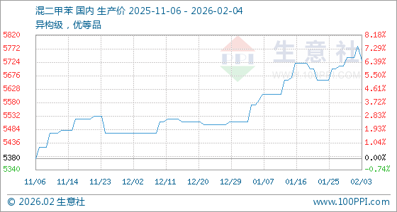 2月4日,生意社混二甲苯基准价为5730.00元/吨,与本月初(5740.00元/吨)相比,下降了0.17%。