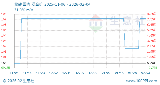 2月4日,生意社盐酸基准价为107.50元/吨,与本月初持平。
