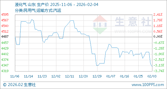 2月4日,生意社液化气基准价为4342.50元/吨,与本月初(4412.50元/吨)相比,下降了1.59%。