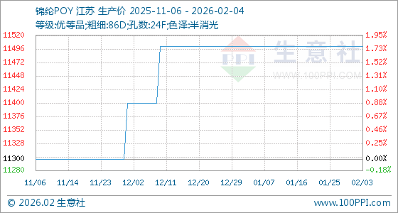 2月4日,生意社锦纶POY基准价为11500.00元/吨,与本月初持平。