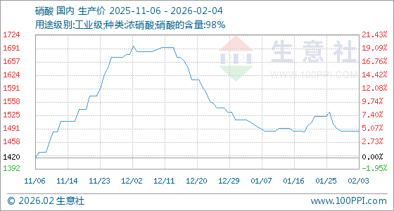2月4日,生意社硝酸基准价为1486.67元/吨,与本月初持平。