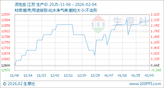 2月4日,生意社活性炭基准价为12900.00元/吨,与本月初(12883.33元/吨)相比,上涨了0.13%。