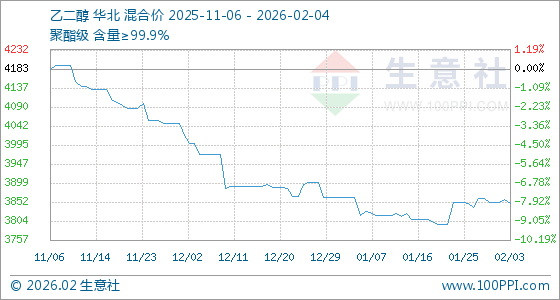 2月4日,生意社乙二醇基准价为3848.33元/吨,与本月初(3850.00元/吨)相比,下降了0.04%。