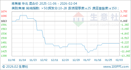 2月4日,生意社炼焦煤基准价为1476.25元/吨,与本月初持平。