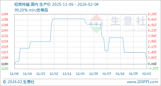 2月4日,生意社轻质纯碱基准价为1198.00元/吨,与本月初(1208.00元/吨)相比,下降了0.83%。