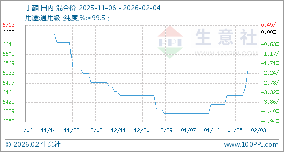 2月4日,生意社丁酮基准价为6550.00元/吨,与本月初持平。