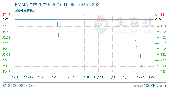 2月4日,生意社PMMA基准价为15033.33元/吨,与本月初持平。