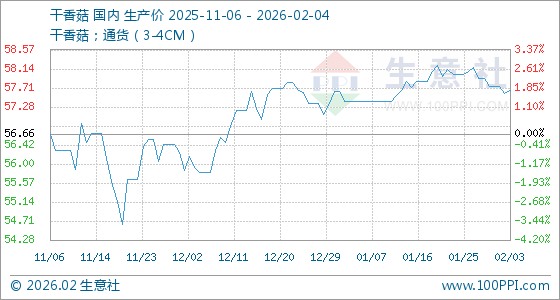 2月4日,生意社干香菇基准价为57.65元/公斤,与本月初(57.74元/公斤)相比,下降了0.16%。