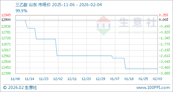 2月4日,生意社三乙胺基准价为12444.44元/吨,与本月初持平。