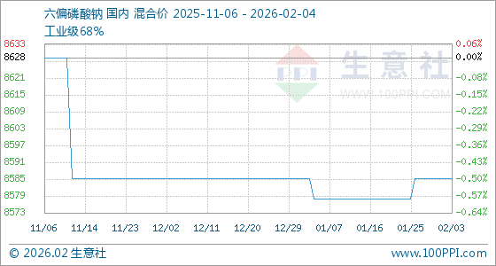 2月4日,生意社六偏磷酸钠基准价为8585.71元/吨 ,与本月初持平。