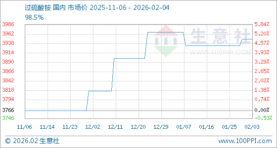 2月4日,生意社过硫酸铵基准价为3950.00元/吨,与本月初持平。