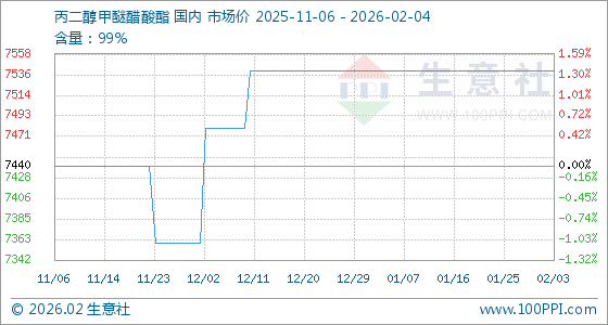 2月4日,生意社丙二醇甲醚醋酸酯基准价为7540.00元/吨,与本月初持平。