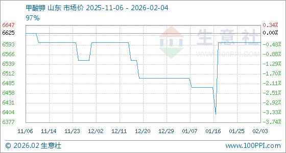 2月4日,生意社甲酸钾基准价为6600.00元/吨,与本月初持平。