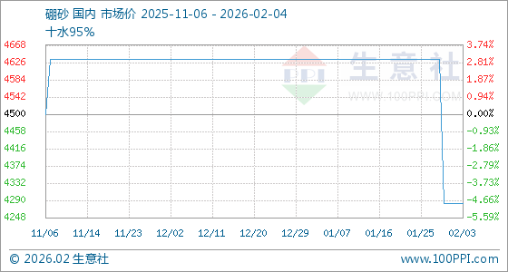 2月4日,生意社硼砂基准价为4283.33元/吨,与本月初持平。