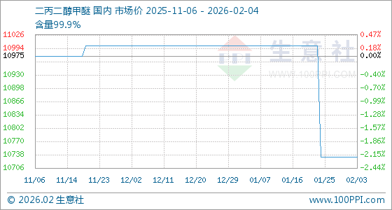 2月4日,生意社二丙二醇甲醚基准价为10733.33元/吨,与本月初持平。