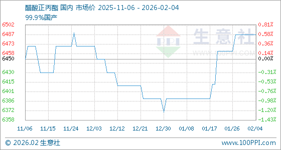 2月4日,生意社醋酸正丙酯基准价为6487.50元/吨,与本月初持平。