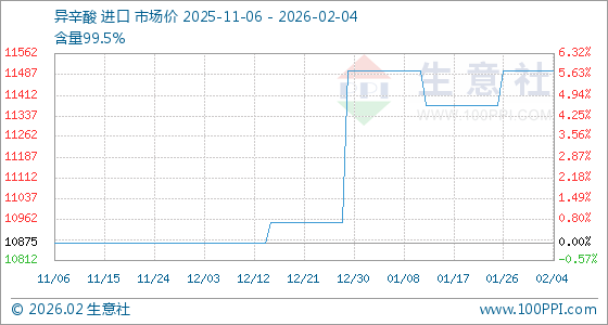 2月4日,生意社异辛酸基准价为11500.00元/吨,与本月初持平。