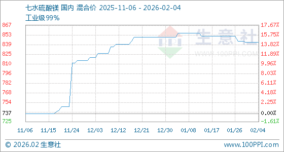 2月4日,生意社七水硫酸镁基准价为842.50元/吨,与本月初持平。