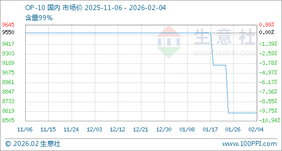 2月4日,生意社OP-10基准价为8600.00元/吨,与本月初持平。