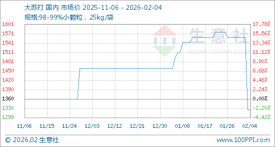 2月4日,生意社大苏打基准价为1325.00元/吨,与本月初(1560.00元/吨)相比,下降了15.06%。
