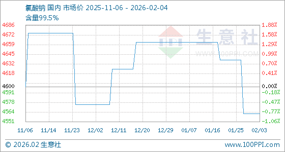 2月4日,生意社氯酸钠基准价为4562.50元/吨,与本月初持平。
