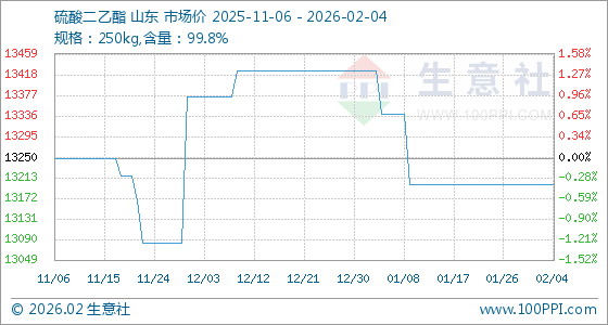 2月4日,生意社硫酸二乙酯基准价为13200.00元/吨,与本月初持平。