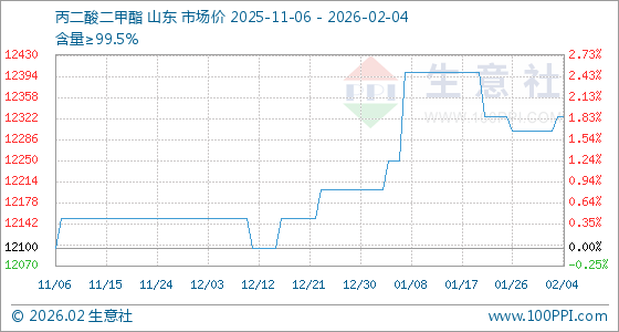 2月4日,生意社丙二酸二甲酯基准价为12325.00元/吨,与本月初(12300.00元/吨)相比,上涨了0.20%。