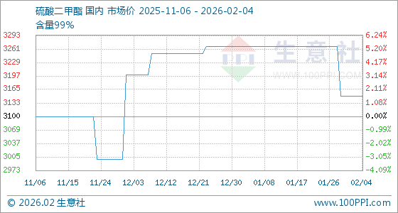 2月4日,生意社硫酸二甲酯基准价为3150.00元/吨,与本月初持平。