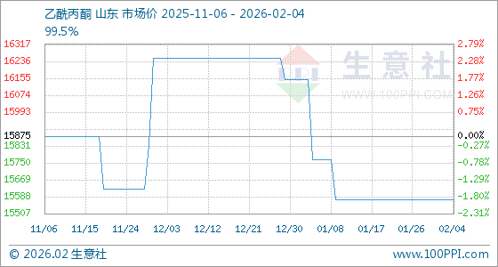 2月4日,生意社乙酰丙酮基准价为15575.00元/吨,与本月初持平。