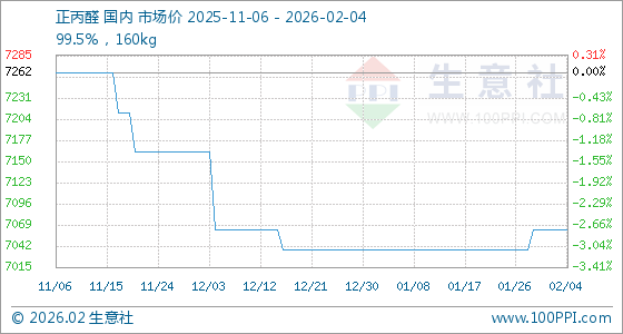 2月4日,生意社正丙醛基准价为7062.50元/吨,与本月初持平。