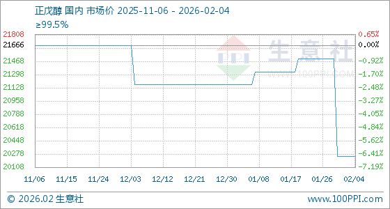 2月4日,生意社正戊醇基准价为20250.00元/吨,与本月初持平。