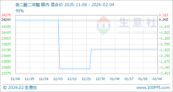 2月4日,生意社癸二酸二辛酯基准价为23750.00元/吨,与本月初持平。