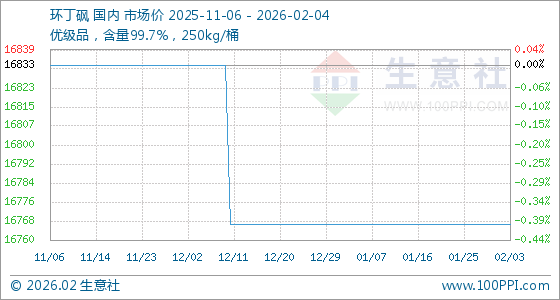 2月4日,生意社环丁砜基准价为16766.67元/吨,与本月初持平。