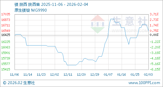 2月4日,生意社镁基准价为16550.00元/吨,与本月初(16750.00元/吨)相比,下降了1.19%。