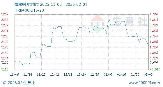 2月4日,生意社螺纹钢基准价为3181.00元/吨,与本月初(3200.34元/吨)相比,下降了0.6%。