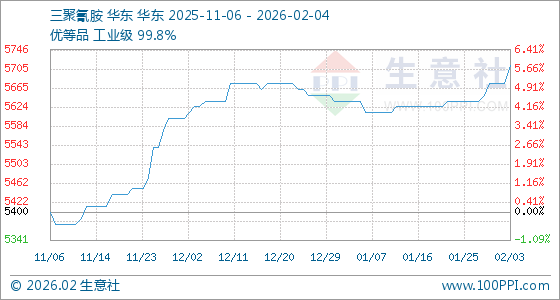 2月4日,生意社三聚氰胺基准价为5712.50元/吨,与本月初(5675.00元/吨)相比,上涨了0.66%。