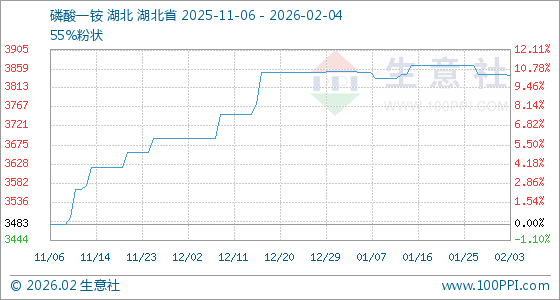 2月4日,生意社磷酸一铵基准价为3843.33元/吨,与本月初(3846.67元/吨)相比,下降了0.09%。