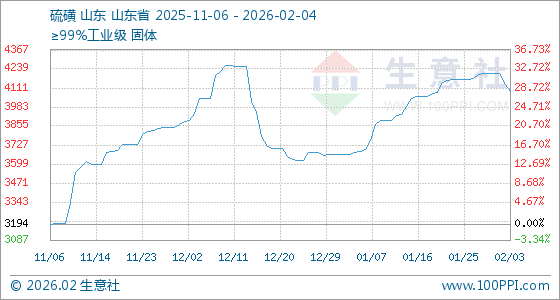 2月4日,生意社硫磺基准价为4086.67元/吨,与本月初(4210.00元/吨)相比,下降了2.93%。