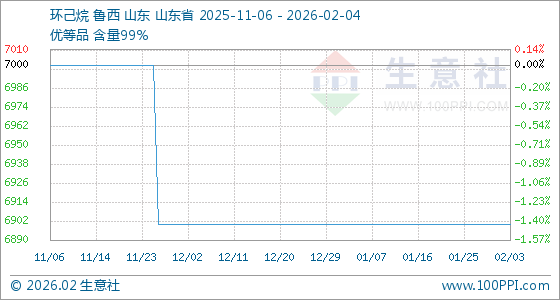 2月4日,生意社环己烷基准价为6900.00元/吨,与本月初持平。