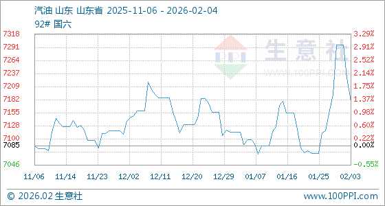 2月4日,生意社汽油基准价为7179.20元/吨,与本月初(7296.00元/吨)相比,下降了1.6%。