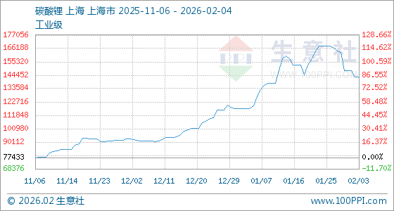 2月4日,生意社碳酸锂(工业级)基准价为143000.00元/吨,与本月初(148000.00元/吨)相比,下降了3.38%。