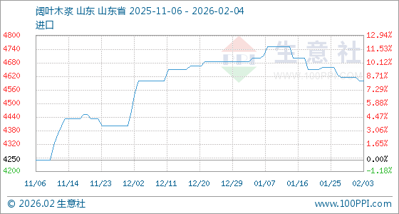 2月4日,生意社阔叶木浆基准价为4600.00元/吨,与本月初(4616.67元/吨)相比,下降了0.36%。