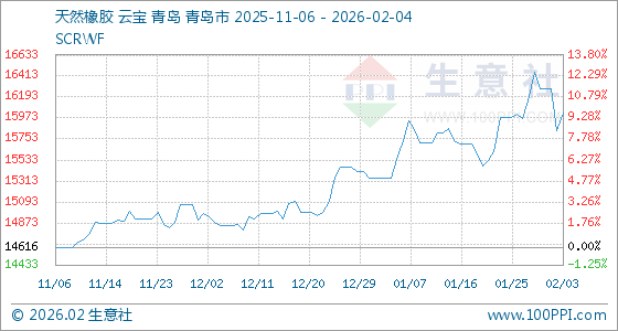 2月4日,生意社天然橡胶基准价为16025.00元/吨,与本月初(16275.00元/吨)相比,下降了1.54%。