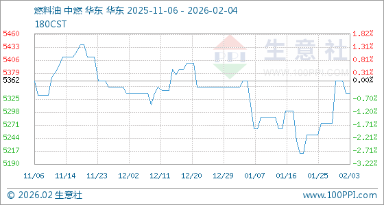 2月4日,生意社燃料油基准价为5337.50元/吨,与本月初(5362.50元/吨)相比,下降了0.47%。