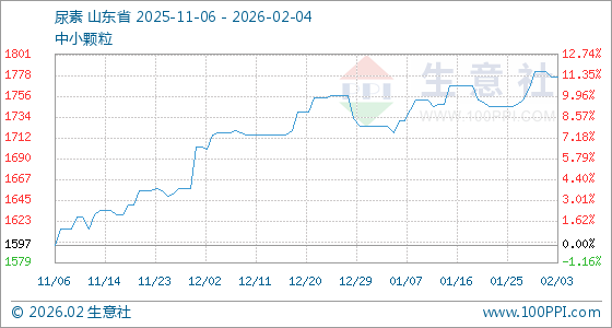 2月4日,生意社尿素基准价为1777.50元/吨,与本月初(1782.50元/吨)相比,下降了0.28%。