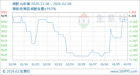 2月4日,生意社顺酐基准价为5262.50元/吨,与本月初持平。