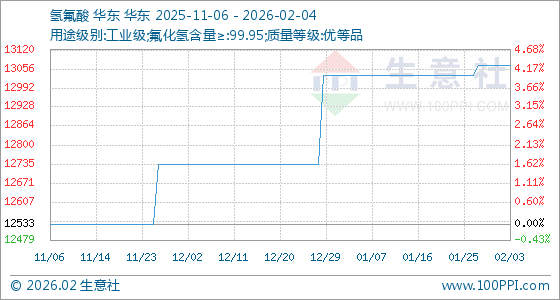 2月4日,生意社氢氟酸基准价为13066.67元/吨,与本月初持平。